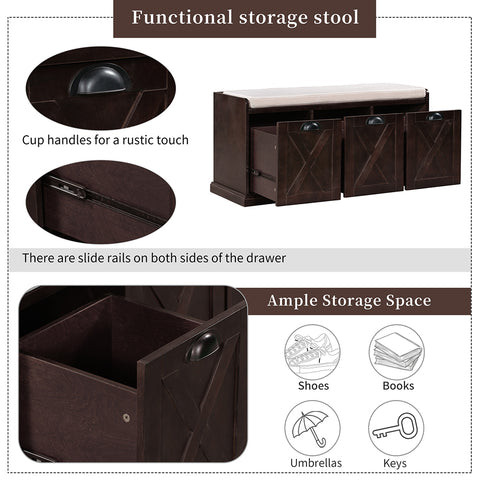 2.This functional bench has a rectangular, engineered wood frame that features three pullout drawers with barn door fronts and cup handles for a rustic touch. There are slide rails on both sides of the drawer for smoother use of the drawer. Each of the drawers meet the needs of multi-functional storage at home, and are ideal for storing books, shoes, umbrellas and other small items