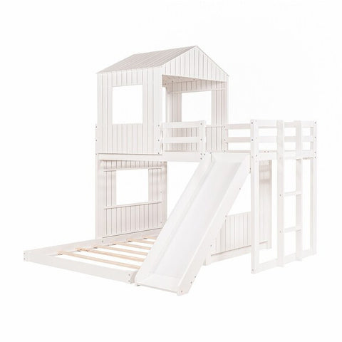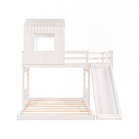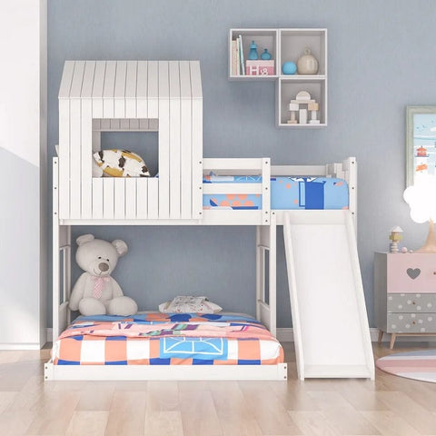 Give the family in your life a playhouse that will bring hours of fun combined with a fully functional bunk bed for the perfect two-in-one bedroom addition. With a design loved by parents and family alike, this bunk is completed with a simple silhouette and natural weathered wood grain to serve as a tasteful statement piece in your family bedroom that they can enjoy for hours on end. Crafted as a cabin-inspired playhouse with square windows on the top and bottom bunk and the slide on the side, this bed doubles as a semi-enclosed play place to let the imagination of your family run wild. Enjoy this bunk for years to come with its durable build, manufactured with quality lumber and pinewood to withstand horseplay, scratching and other untimely wear. Assemble according to your personal preference, with assembly options allowing for the bottom bed to be on the left or right side in accordance to your room layout. Comes complete with thick slats to preserve the life of your mattress.