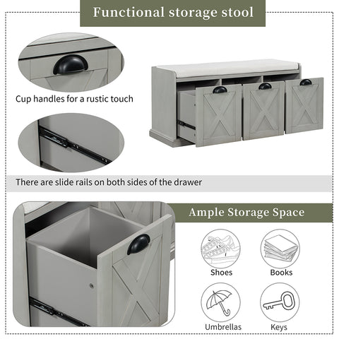2.This functional bench has a rectangular, engineered wood frame that features three pullout drawers with barn door fronts and cup handles for a rustic touch. There are slide rails on both sides of the drawer for smoother use of the drawer. Each of the drawers meet the needs of multi-functional storage at home, and are ideal for storing books, shoes, umbrellas and other small items